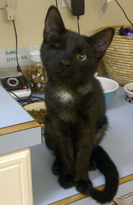 Delios My One Eyed Black Kitten (or “D” as we call him) is the first one-eyed cat I’ve adopted. Here are a few tips about living with a one-eyed cat in the event that you are considering adopting one, or if your cat should need an eye removed for some reason.